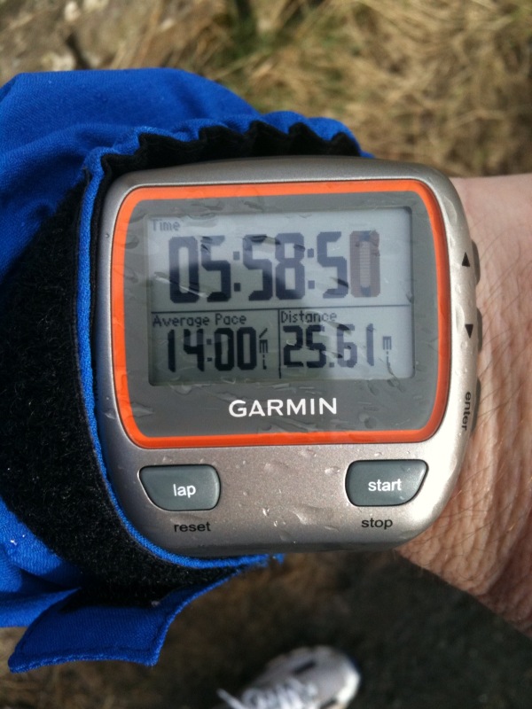 I was very relieved to see Katy and Jack in the support car at exactly 25 miles. I stopped for 3 minutes or so to have a good drink and with another quick calculation I figured out that 07:30:00 was still doable. But only just!